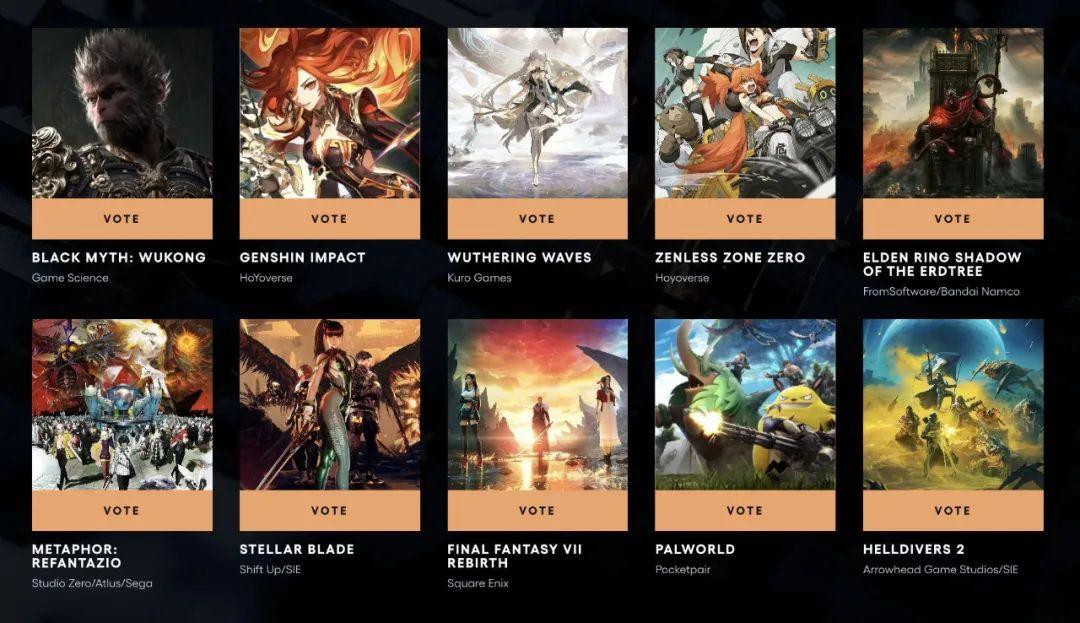 TGA“玩家之聲”第二輪投票開啓,50款遊戲現在剩下了10款,有趣的是,國產遊戲佔據了接近半壁江山,《黑神話:悟空》《原神》《鳴潮》《絕區零》都晉級到了前十名。第二輪投票最終將有5款遊戲晉級到第三輪。