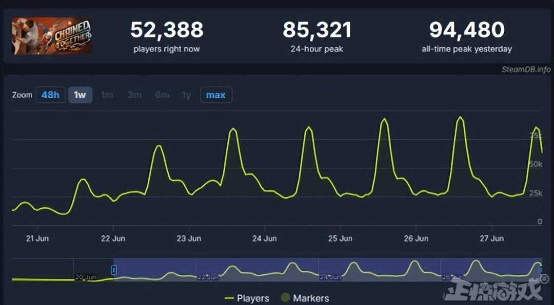 《鏈在一起》是一款支持4人聯機的攀爬跳躍遊戲,遊戲上線短短一週內同時在線人數就突破了9萬人,超高好評率加上22元的白菜價,也使得遊戲在發售首周順利殺入了Steam暢銷榜周榜前十。