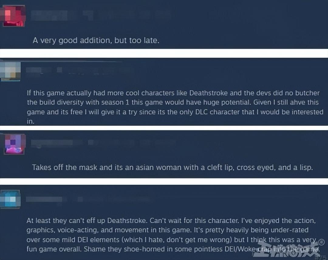 這次《自殺小隊》的更新的喪鐘沒有搞政治正確,但是來的太慢了。對於遊戲的停更有網友表示,這次更新很好,但來的太晚了。也有網友直言,要是一開始就出喪鐘這樣的角色,不去搞那些政治正確的內容,這遊戲還是能火的。也有網友調侃,喪鐘摘下面具是一個斜眼歪嘴的亞裔女性。還有網友感慨,這是一款被強行政治正確搞砸的遊戲,如今他們再沒機會玷污喪鐘了。