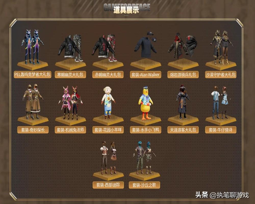 如圖所示,在此次賽事版和平集市裏,出現了多個大禮包、套裝,其中的大禮包分別是PEL轟鳴競夢者、寒蠍/赤蠍幽靈、熔岩遊騎兵、沙漠守護者、天涯浪客;套裝分別是Alan Walker、奇妙探長、機械兔法師、花園小羊咩、水手小飛鴨、牛仔情詩、西部迷蹤、沙丘之歌。