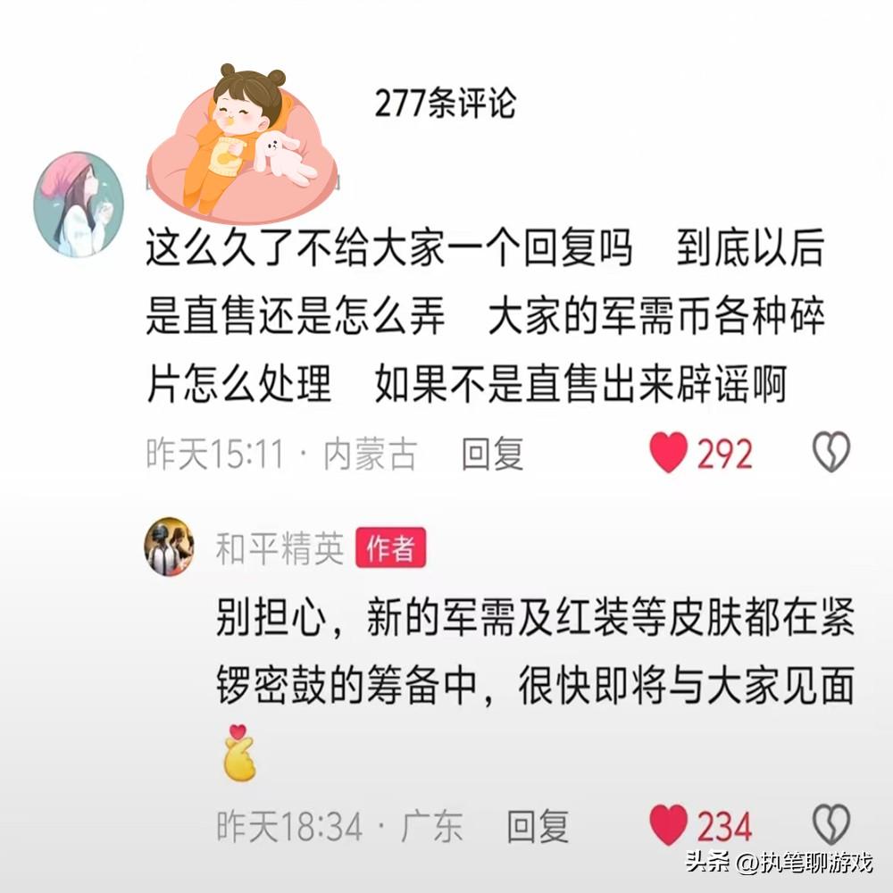 當玩家們多次詢問之後,光子也算是給出了正面回應:新的軍需及紅裝等皮膚都在緊鑼密鼓的籌備中,很快即將與大家見面。