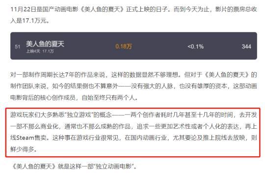 甚至還有遊戲媒體人現身說法,以獨立遊戲去類比這部電影,指出當創作者追求更爲藝術化或個人化的表達時,確實可能在商業收益上面臨挑戰。