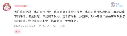 —也許略顯粗糙,也許劇情平淡,也許通篇下來全無優點,也許它會是各項都是中等甚至偏下的評分。但是我想,不是出於私心,這個作品我十分期待,2人6年的作品會帶給觀衆怎樣的感情。我很喜歡這句話,滿是感情,全無技巧。