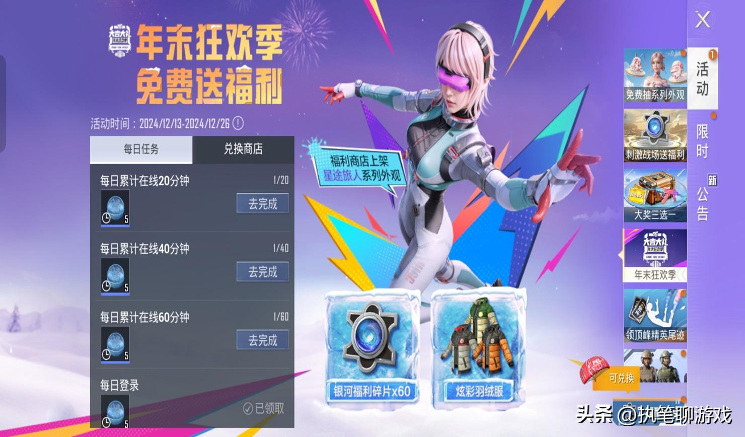 如圖所示,在“年末狂歡季”主題中我們可以看到:通過每日在線時間即可獲得相對應的碎片,使用碎片可以兌換3套新衣服。