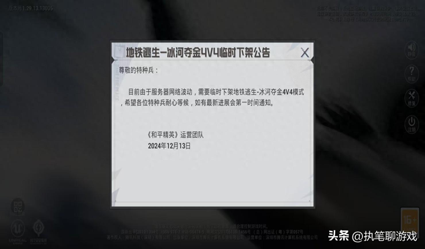 爲了能夠了解一手資訊,天哥也是第一時間前往遊戲中一探究竟,收到光子發出來的公告:由於服務器網絡波動,需要臨時下架“地鐵逃生-冰河奪金4V4”模式,後續如有最新進展會第一時間通知。