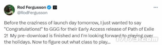 《暗黑破壞神4》總經理Rod Fergusson曾在社交媒體上發文祝賀了開發商Grinding Gear Games及其遊戲《流放之路2》的發佈:“在發佈前夕這種瘋狂的氛圍下,我只想對GGG《流放之路2》搶先體驗版的發佈表示祝賀。我已經完成了預下載,期待着假期期間能玩上這款遊戲。現在要弄清楚要玩什麼職業...”