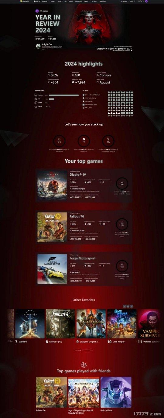 今年斯賓塞遊玩時間最長的遊戲是《暗黑破壞神4》,他在這款遊戲上花費了261小時。除了《暗黑破壞神4》,斯賓塞在《輻射76》上花費了100小時,在《極限競速:Motorsport》上花費了27小時。