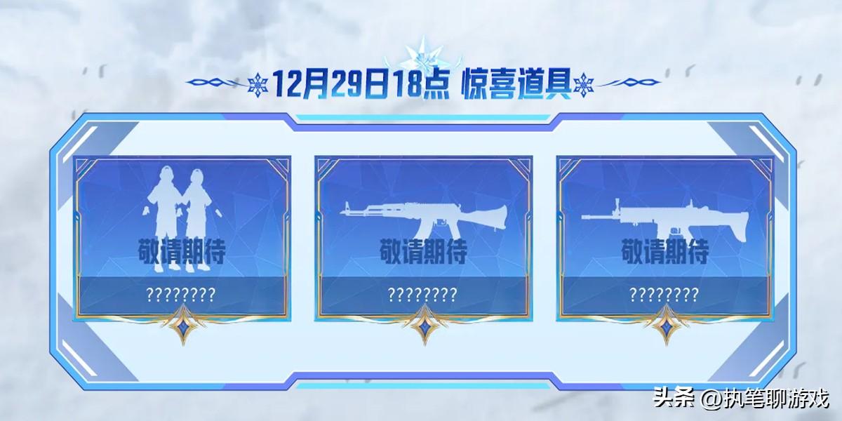 在12.29的18點,還出現了3個“敬請期待”的驚喜道具,從外觀來看的話,起碼有一套衣服以及2個槍皮,不知道是不是升級紅裝、9級槍呢?由於平日裏的光子完全不按常理出牌,所以一切皆有可能。