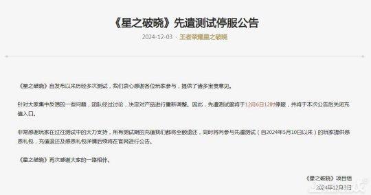 騰訊還在內測期間的《星之破曉》,忽然宣佈遊戲將於12月6日關停先遣測試,這次先遣測試是在5月10日纔開始的。關停後遊戲裏已充值的玩家將全額退款,停服的原因官方宣稱說要對產品重新進行調整。
