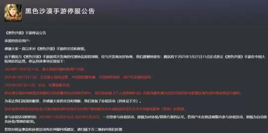 由Pearl Abyss開發、騰訊代理的手遊《黑色沙漠Mobile》發佈國區停運公告,宣佈將於2025年1月27日正式停止運營。