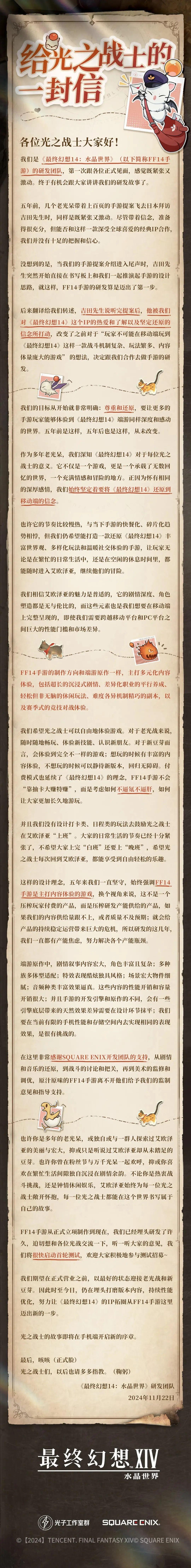 早在FF14手遊首曝後不久,光子方面的研發團隊就寫了致光之戰士(FF14中玩家稱謂)的一封信,信中提到5年前,他們幾位老光呆帶着上百頁的手遊提案拜訪了吉田,且目標從一開始就非常明確:尊重和還原FF14。