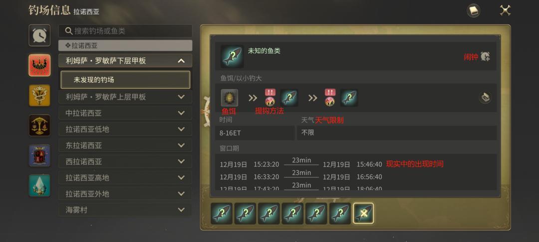 再比如釣魚佬必看的釣魚筆記,在顯示釣場位置、釣場裏的魚類以外,FF14手遊還補充了釣不同魚所需的魚餌、提鉤手法、天氣條件、現實世界中該魚類的出現時間,以及鬧鐘功能……以前在端遊裏釣高品質的魚,很多釣魚佬都得一邊開着遊戲一邊看魚糕(飯制釣魚資料站),現在手遊直接顯示這些信息,屬實是讓釣魚佬狂喜的功能補充了;