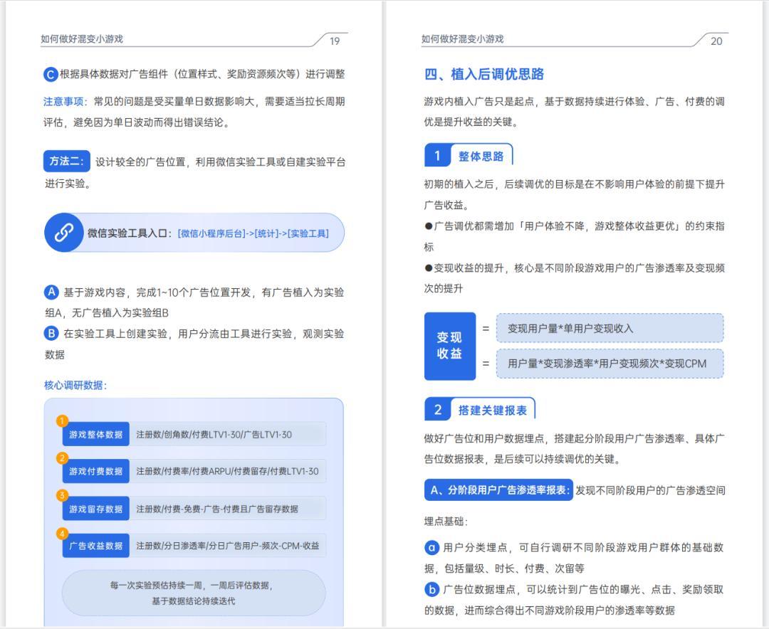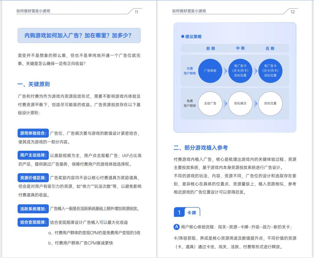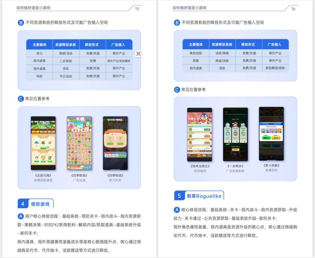 這次生態峯會的節點,騰訊廣告終於整合近一年的研究成果,推出了《2024小遊戲混合變現商業化白皮書》,其中詳細記述了如何清晰認知混變的定位,設計混變產品的原則、混變可能遇到的誤區,以及針對卡牌、模擬經營、二合、塔防、肉鴿等不同品類,如何量化和設計廣告,乃至如何投放等。