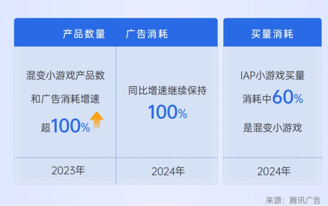 2023年混變小遊戲產品數和廣告消耗增速超100%,2024年同比增速繼續保持在100%,而且IAP小遊戲買量消耗中60%是混變小遊戲。