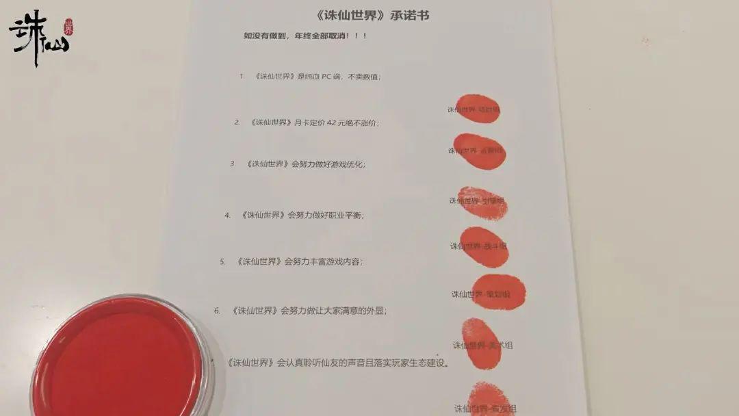 在上線前,官方還發布了一份項目組的承諾書。承諾不賣數值、月卡定價絕不漲價,以及努力做好職業平衡、遊戲內容等事項,讓對應的組長按了手印。“如沒有做到,年終全部取消!!!”