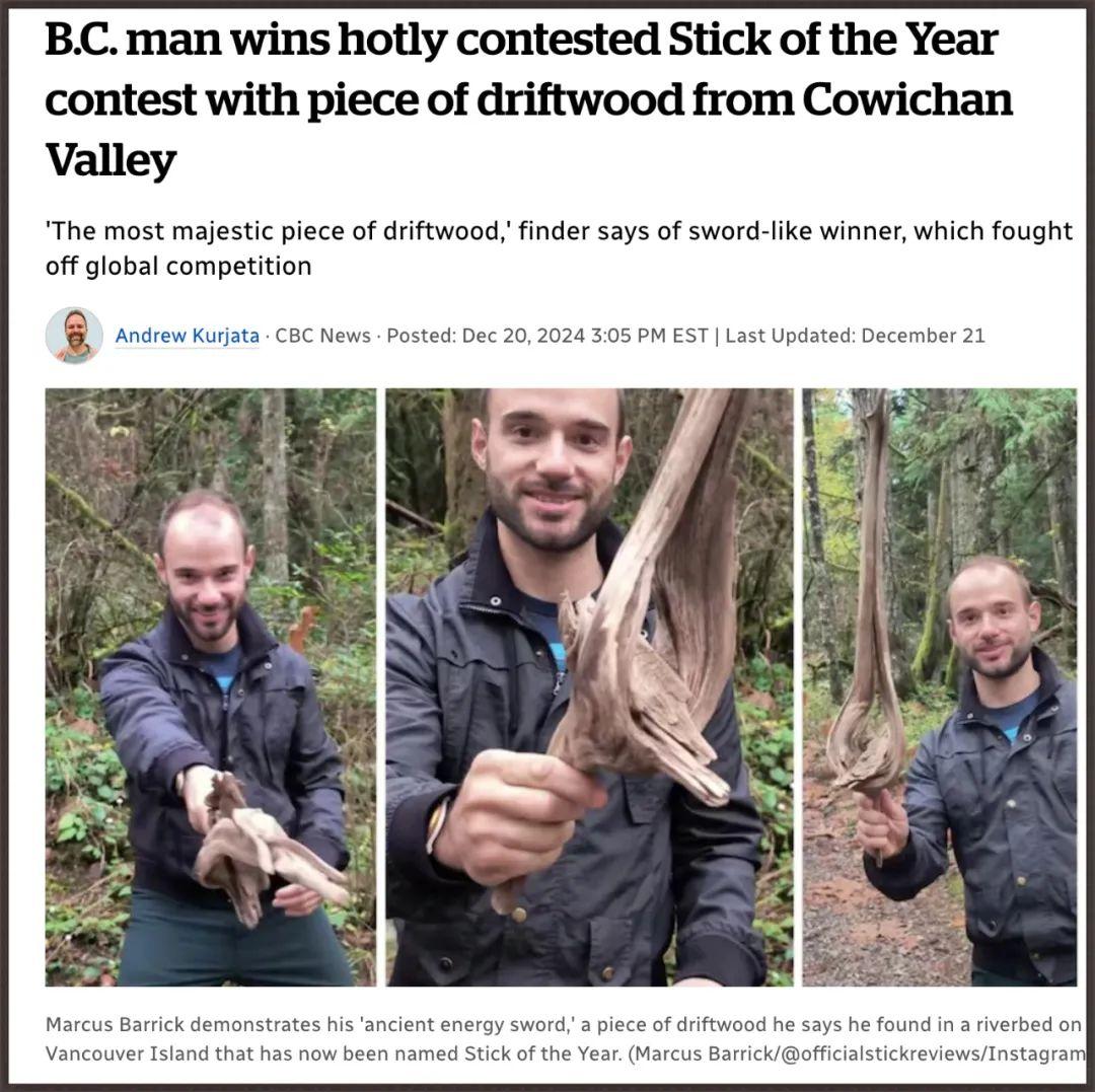 一位叫「馬庫斯·巴里克」的大叔在溫哥華找到的木棍,以微弱的票數優勢贏得了首屆「年度木棍」冠軍。