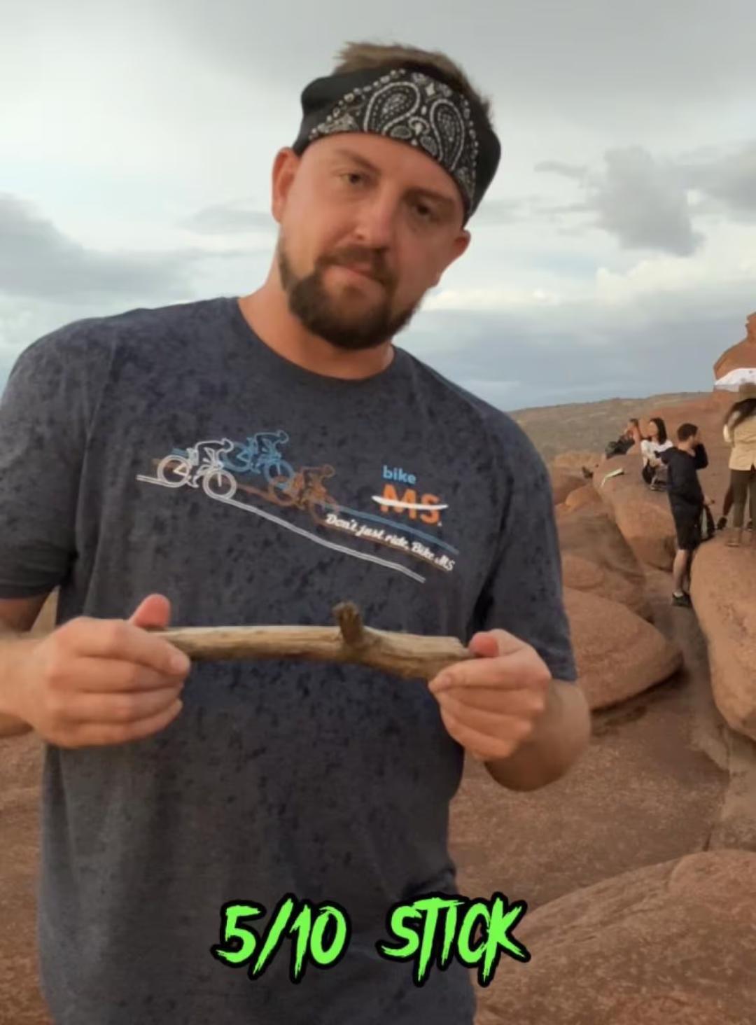 去年有一天,他們在美國猶他州旅行時撿到了一根不錯的棍子,簡單拍攝了第一篇木棍評論的短視頻,內容就是0~10給棍子打分。
