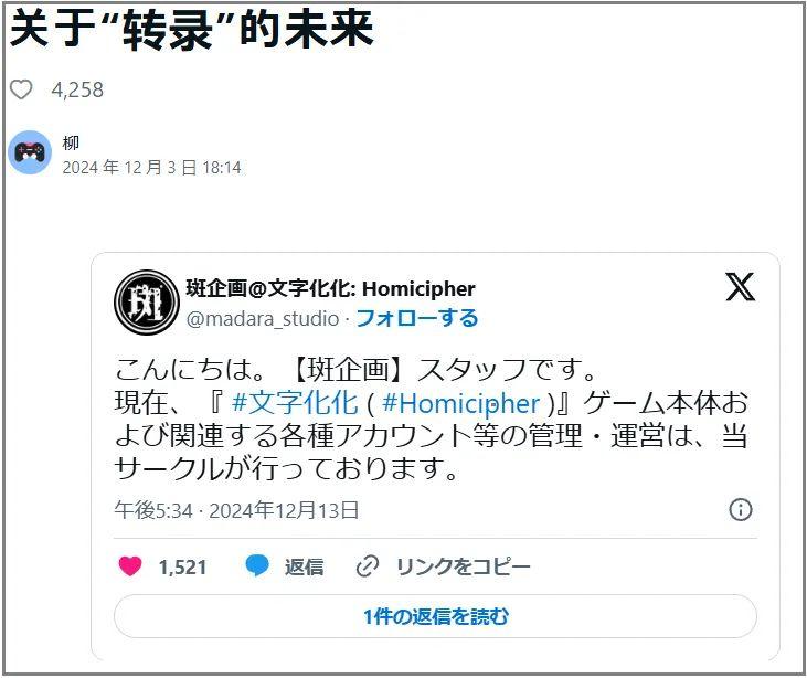 坦白地說,八名木的言行暫時還沒引起非常激烈的水花。一方面是因爲,製作人的聲明僅在她的個人博客網站上發表,尚未傳遞給大多數人。另一方面,雖然《文字化化》是日本遊戲,但在中國人氣最高,Demo版本1600多條Steam評論中有1000+是中文評論,正式版的簡體中文評論佔比也有3分之1。就連遊戲發行商Gamera games也是一家中國公司。