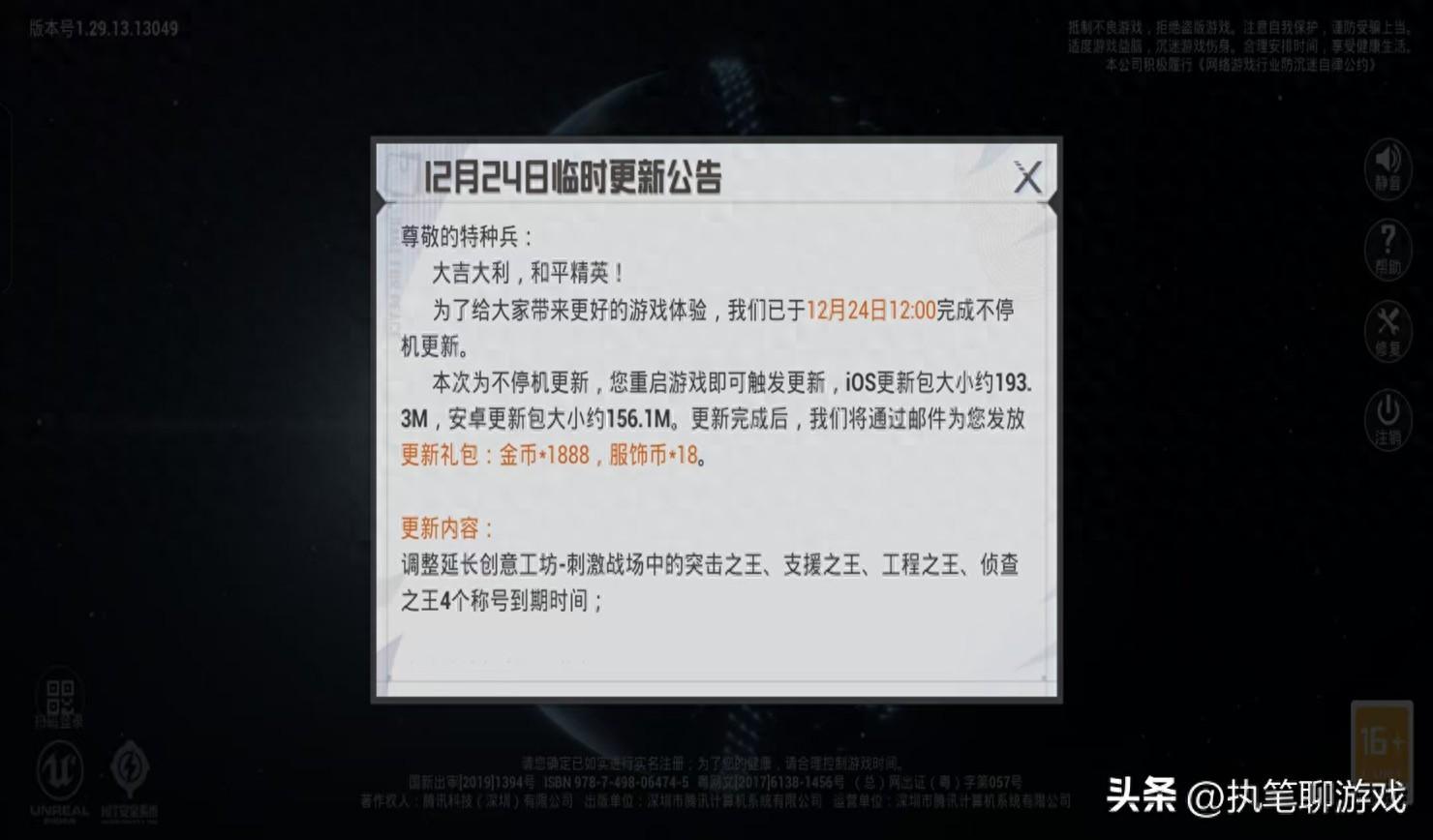 在聖誕即將來臨之際,《和平精英》迎來了193M的小更新,光子對外公佈的更新公告裏只有1個“延長”:調整延長創意工坊“刺激戰場”中的突擊之王、支援之王、工程之王、偵查之王4個稱號的時間。
