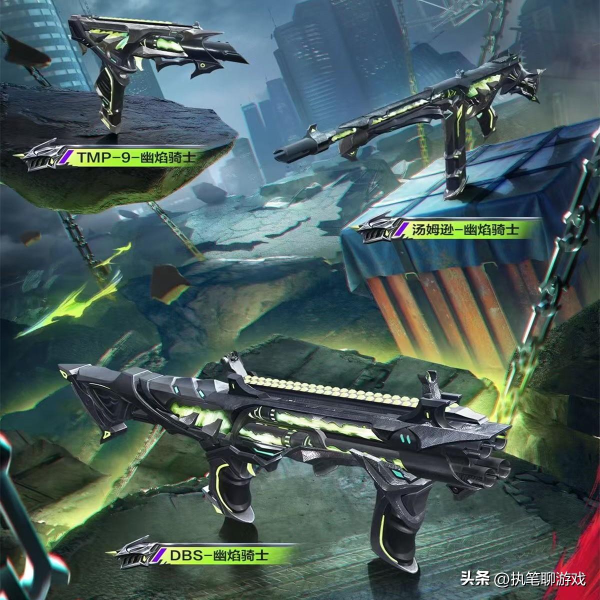 可惜接下來的3個普通槍皮略顯普通了,而且還不是登場概率較高的主流類型,它們分別是TMP9、湯姆遜、DBS,同樣以黑色爲主,加入了一些綠色幽焰特效。不怕大家笑話,如果沒有綠色幽焰的話,看起來與“原皮”幾乎沒有什麼太大的區別。