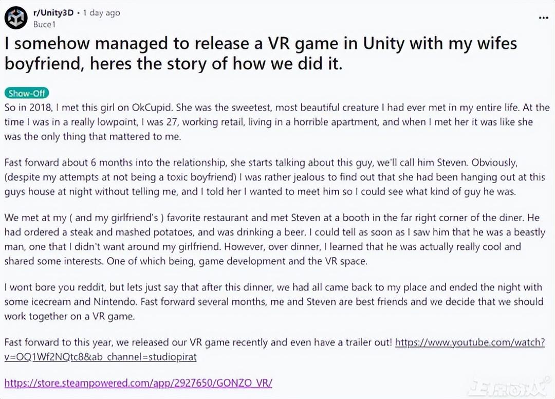 他妻子的男朋友不僅給Buce1規劃了未來的人生道路,還手把手教他做遊戲,這纔有了《GONZO VR》這款遊戲,三個人幸福地生活在一起!