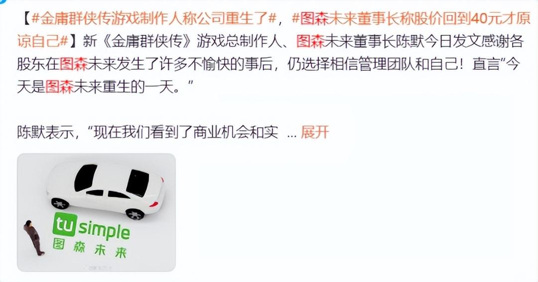 更爲離譜的是,在負面輿論發酵之際,新《金庸羣俠傳》遊戲總製作人、圖森未來董事長陳默還特意寫了一篇文章進行回應,稱該作能讓圖森未來的年利潤飆升到5億美元(約36.4人民幣)?!