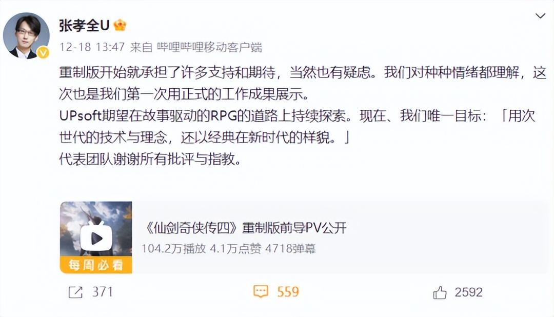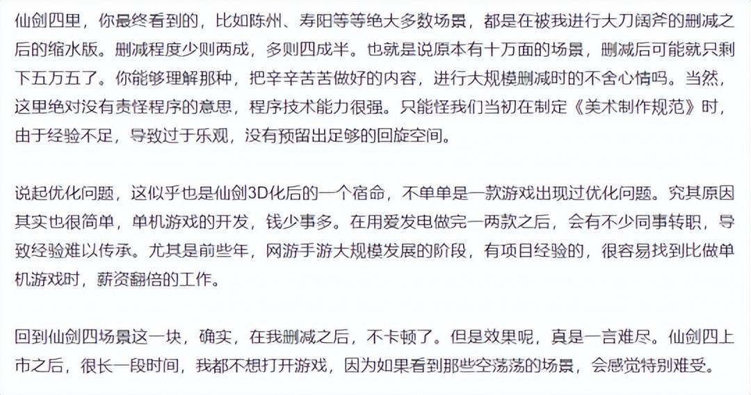 與此同時,原《仙劍4》主美術老薑也髮長文談及了該前導PV。他透露因爲受制於當年的技術瓶頸,很多做好的東西最後因爲會引起畫面卡頓的關係沒放上去,原版遊戲裏的陳州、壽陽等等絕大多數場景,都是被進行大刀闊斧的刪減之後的縮水版。