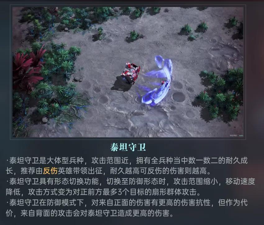 比如說泰坦守衛是大體型的肉盾兵種,切換至防禦形態時可以舉盾,但這個盾只能防禦前方,且攻擊範圍和移速都會下降。與此同時,遊戲中又設計了隱身/反隱、背傷加成等機制,這就對玩家的實時操作,以及對戰局的判斷提出了更多的要求。