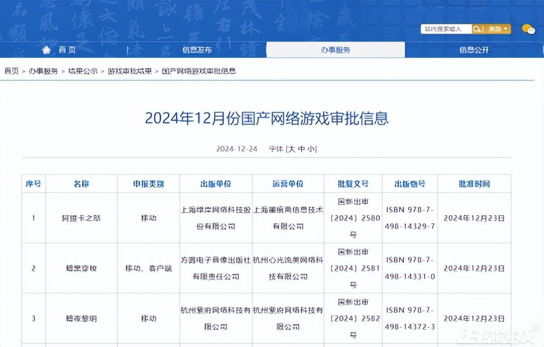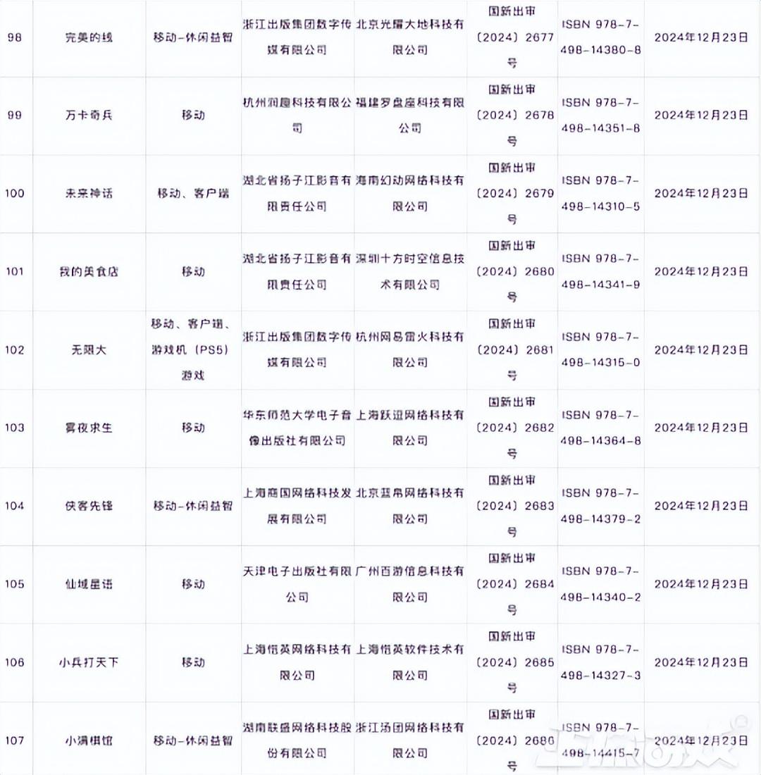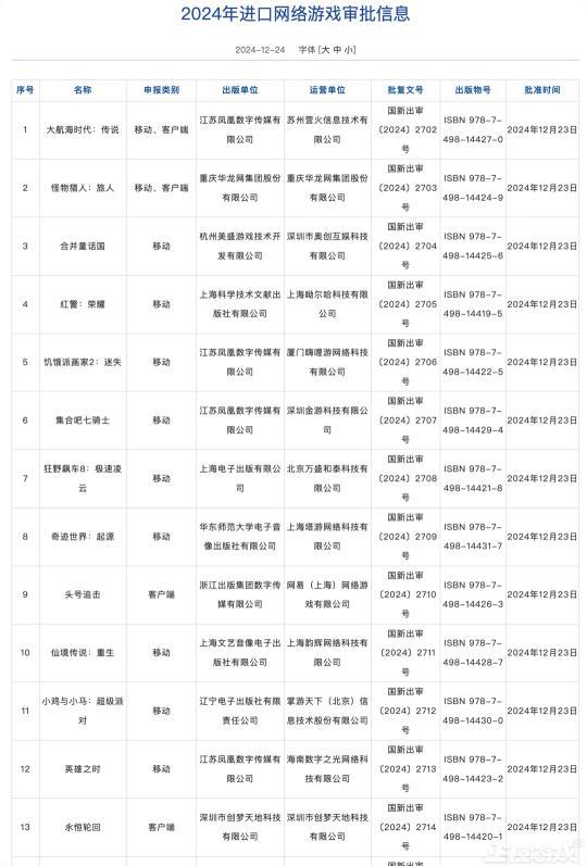 12月24日,國家新聞出版署公佈了2024年12月份的遊戲版號名單,其中包括122款國產網絡遊戲與13款進口網絡遊戲。在國產遊戲中,網易的《無限大》、悠星的《礦野求生》、4399的《造夢西遊錄》、殼木的《第七紀倖存者》等諸多知名遊戲在列。而進口遊戲方面,騰訊的《怪物獵人:旅人》、網易的《頭號追擊》、創夢天地的《永恆輪迴》等也成功獲批。