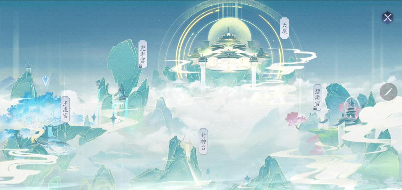 在地圖設計上,遊戲亦是從“熟悉原則”出發,在順應玩家想象的基礎上進行一些再加工,仙氣繚繞的玉虛宮、神祕幽邃的東海龍宮、威嚴肅穆的天庭、人間煙火氣的陳塘關……這些貼近玩家認知的建築設計,進一步提升了遊戲的沉浸感。遊戲的小地圖則是以古色古香的2D水墨畫風勾勒而出,於細節處彰顯《封神再臨》對東方美學的致敬。