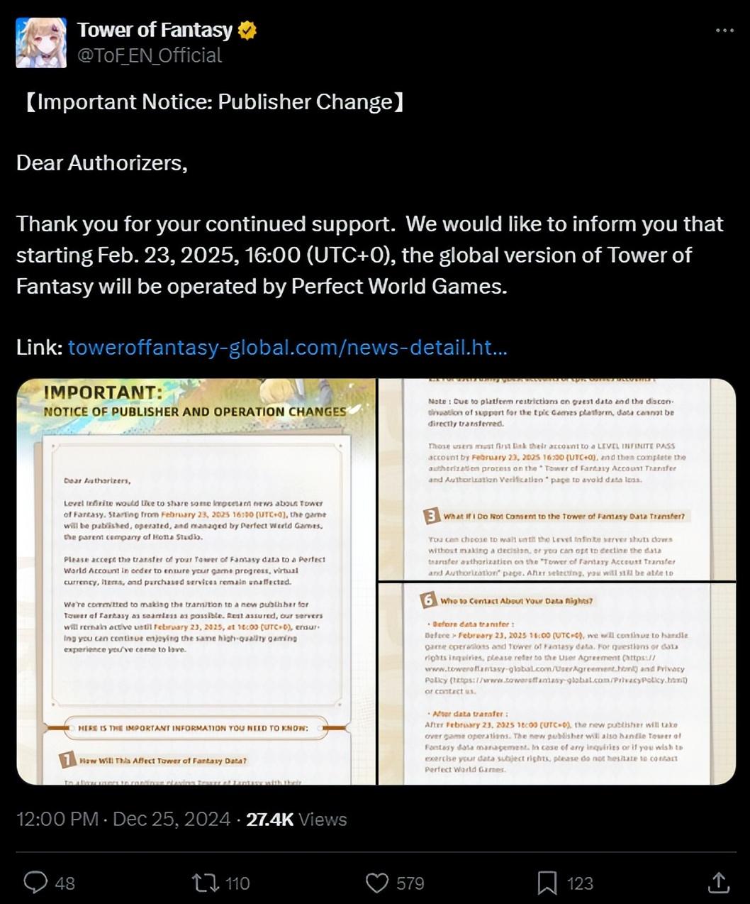 公告內容顯示,玩家想要保留遊戲進度及虛擬貨幣等數據,需要在2024年12月27日至2025年4月24日期間授權《幻塔》的賬號數據轉移。