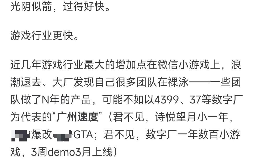 從這個角度來看,科韻路精神,大概也不再能100%概括當下廣州遊戲廠商的內核。那什麼詞能概括呢?這兩天,我看到知乎遊戲答主Paranoia在展望2025時提到了一個詞:廣州速度。不管是通過《望月》衝刺二次元GTA的詩悅,還是4399、三七互娛等廠商在小遊戲領域的小步快跑,似乎都說明,廣州廠商在搶速度、搶機會這件事上,沒慢過。