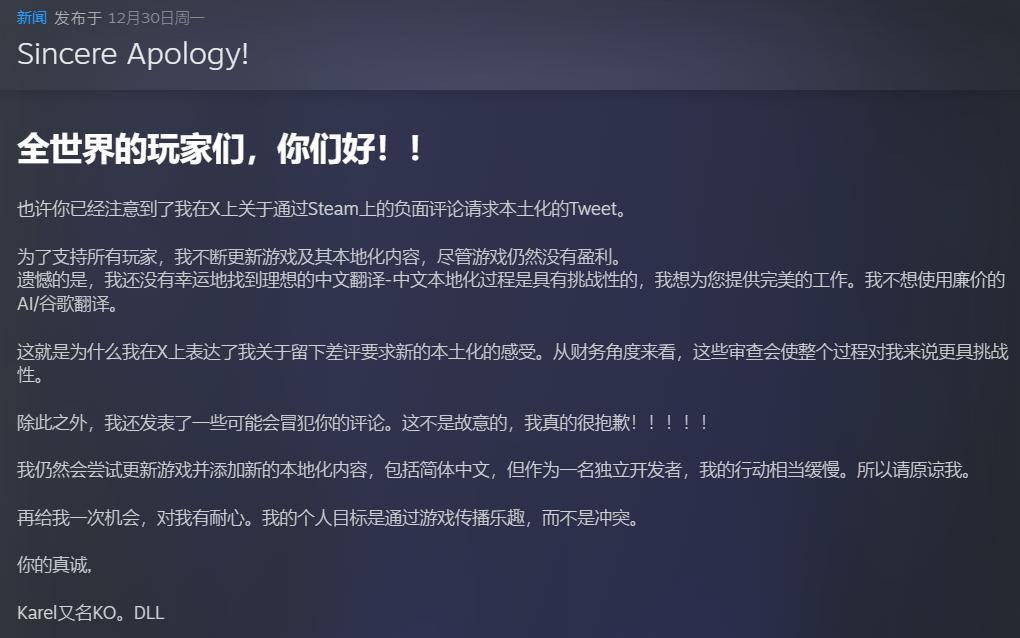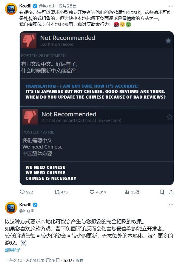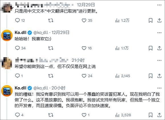 夜間瀨點評:本來只是老生常談的溝通+環境差異,但後來發現國內有人自願製作中文,但開發者不要,不僅如此竟然還給“取消中國翻譯”這種話點贊,實在是不尊重國內玩家……現在的差評轟炸也算是自食惡果吧。