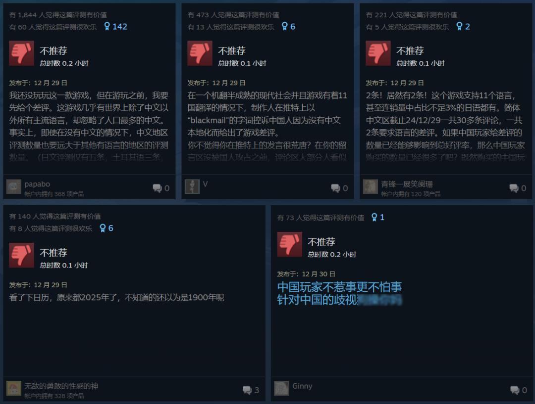 《BZZZT》原本簡中好評率96%,有且僅有兩條需要中文的差評,個人開發者注意到了這兩條評價,並選擇將他們掛了出來,將“沒有中文,所以打差評”視爲了一種勒索。在開發者的視角里,好評率與遊戲銷量直接掛鉤,遊戲賣不出去,開發者沒錢去做本地化,這是一種惡性循環。