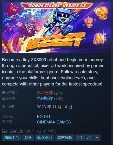 《BZZZT》是一款個人開發的像素風平臺跳躍遊戲,11月14日登陸Steam,遊戲完成度很高,評價不低。遺憾的是《BZZZT》雖然同時支持11國語言,但其中並不包括簡體中文,所以有中國玩家留下“We need Chinese”的評價。