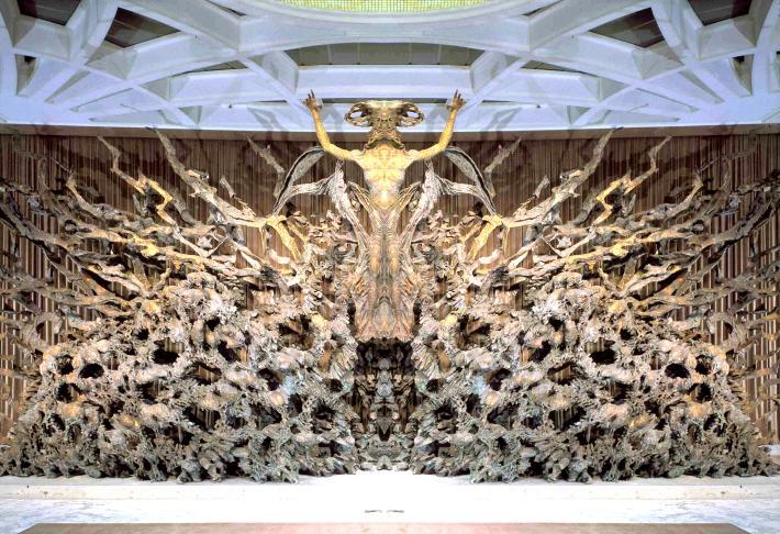 但不論如何,純粹從藝術審美的視角來看,這個雕塑真的酷斃了。很多記者也特別喜歡在教皇辦室內接見會時,把他拍得像一個坐在漆黑恐怖怪物前的神祕BOSS,也不知道教皇本人什麼想法。