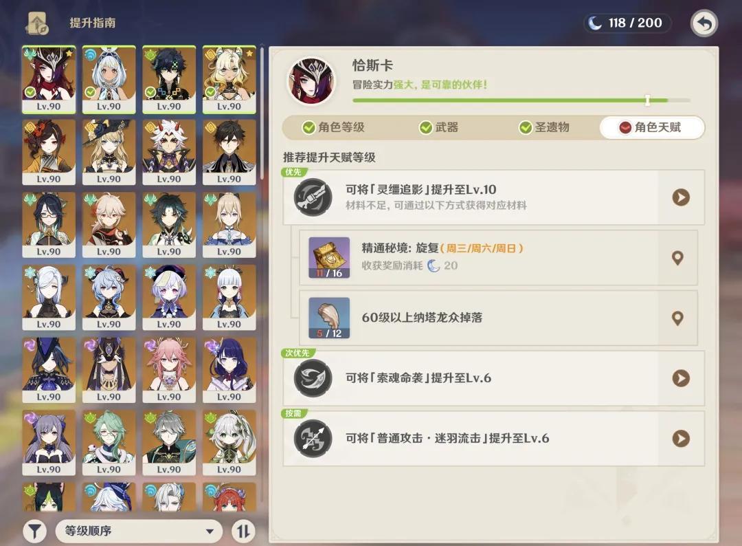 同樣是養成角色,以前我要打開B站查找攻略,學習怎麼升級技能,刷取什麼聖遺物,跟着視頻滿世界跑,在地圖上收集不起眼的材料。而現在,遊戲內置了提升指南,在地圖上標記了角色升級材料的範圍,還有各種各樣的提示路徑。