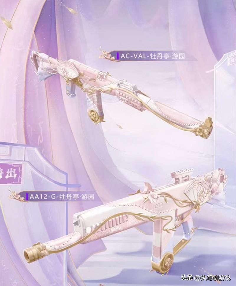 作爲“三粉小轉盤”,皮膚種類自然要一應俱全,“牡丹亭·遊園”同樣如此,首先是槍皮,一個是AC-VAL,一個是AA12-G,在遊戲中的登場概率極其一般。