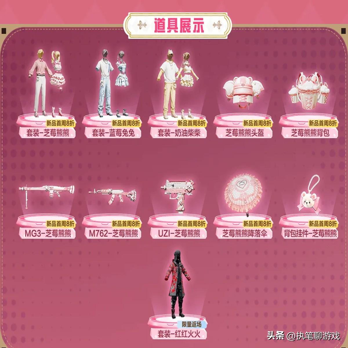 如圖所示,出現在和平集市裏的新直售有3個套裝,分別是芝莓熊熊、藍莓兔兔、奶油柴柴,同時有頭盔、揹包、掛件、降落傘以及MG、M762、UZI等槍皮。