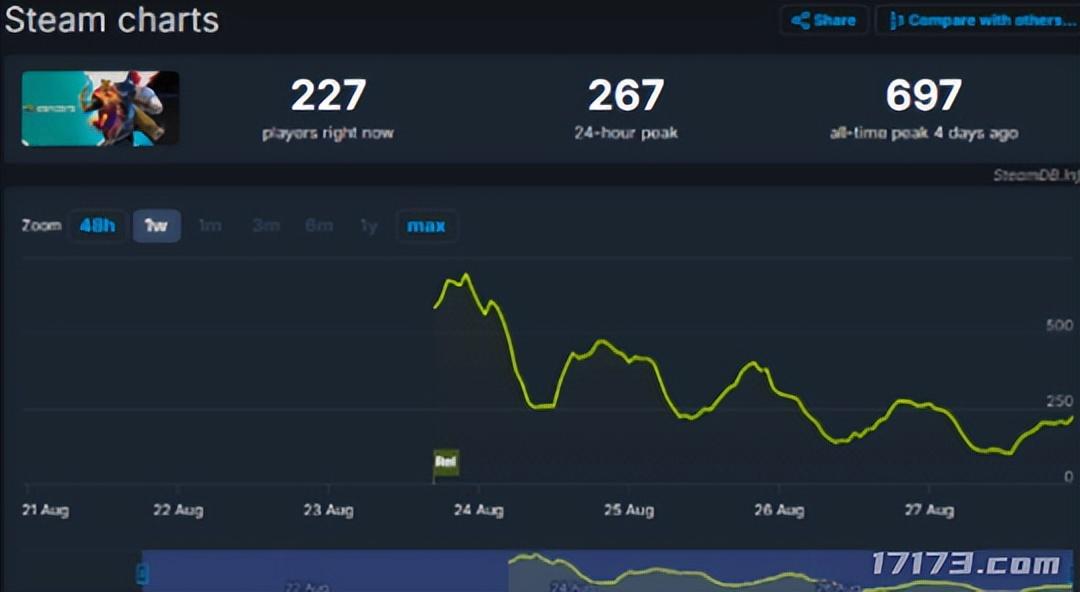 遊戲的熱度和銷量自然受到影響。根據後臺數據網站 SteamDB 顯示,遊戲的同時在線人數最多僅爲14980 人,目前24小時最高在線僅剩在 158 多人。根據玩家持有量統計,遊戲的銷量最低僅爲 7 萬份,最多也只有 22 萬份。