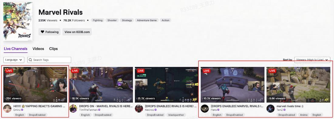 通過Twitch全球多個地區的頭部主播集中曝光,以及大量自發內容和跨頻道聊天內容的傳播,漫威爭鋒在首發當天一度攀升至Twitch遊戲榜單首位,全平臺榜單第二位,遠超其他競爭對手。Youdao Ads邀請了Emiru、Flats、Tenz等頂級主播在12月6日首發當天的不同時間段進行接力直播,實現了全天候覆蓋。在所有參與漫威爭鋒直播的主播中,通過Youdao Ads合作的三位主播(Emiru、Flats、Tenz)分別佔據了榜單的第一、第四和第五名。