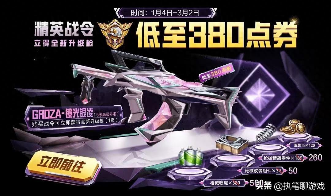 言歸正傳,與以往的戰令手冊相同,自然是5級槍,這一次的主角是“鏡光銀凌Groza”,與之前戰令最大不同之處在於:新增每週福利,每週進入遊戲3天即可領取,其中包含5級槍專屬升級材料。如此一來的話,戰令等級獎勵加上每週福利,就可以直接將5級槍升到滿級了。