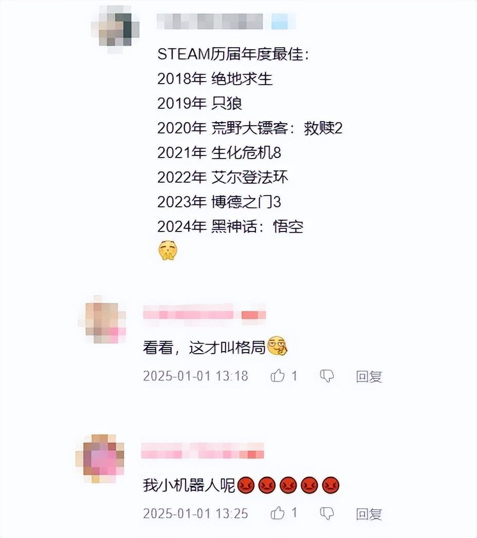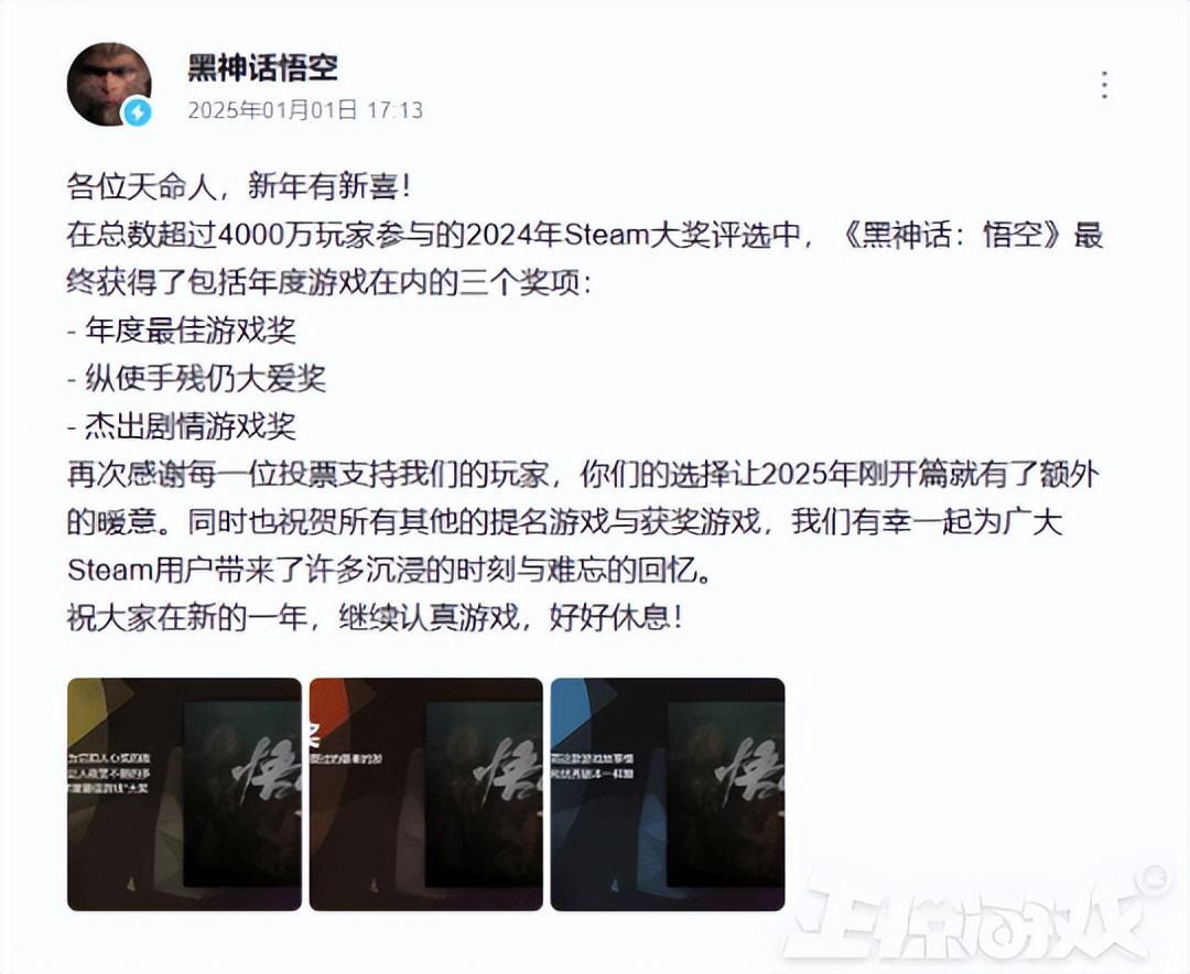 2025年1月1日,《黑神話:悟空》官方傳來喜訊,在總數超過4000萬玩家參與的2024年Steam大獎評選中,該遊戲一舉斬獲年度最佳遊戲、縱使手殘仍大愛獎、傑出劇情遊戲獎三項大獎。