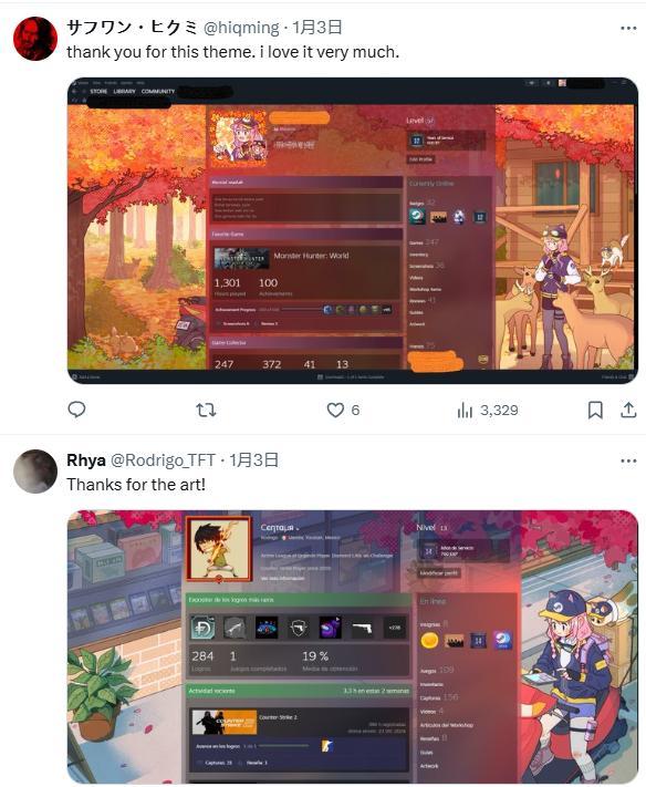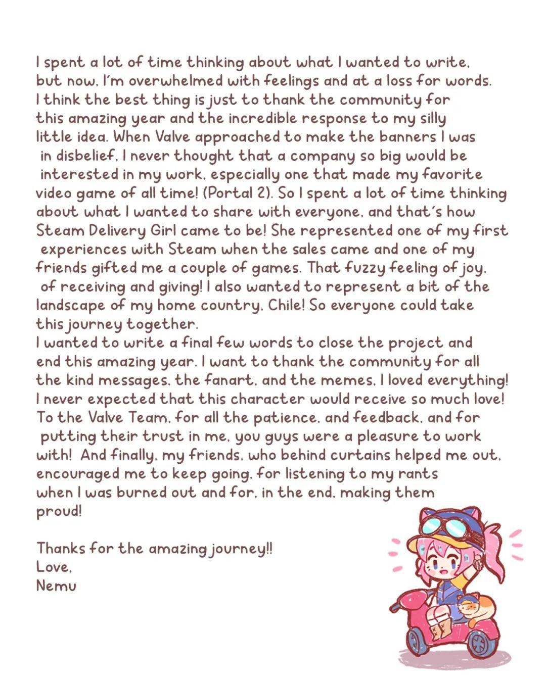 冬促結束當天,創作了看板孃的畫師Nemu(@nemupanart),在X上發佈了感謝賀圖,稱“今天是Steam Delivery Girl的最後一天,我想做個告別”,她感謝了每個人的支持並表示這是自己這輩子最有成就感的項目。隨後她又附上了一篇長文,回顧了與Steam合作的心路歷程。