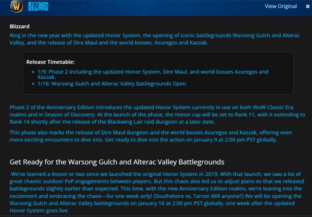 其中,第2階段更新、全新榮譽系統、厄運之槌、世界首領艾索雷苟斯與卡扎克會在1月9日上線,經典戰場“戰歌峽谷”和“奧特蘭克山谷”的開放要等到1月16日。