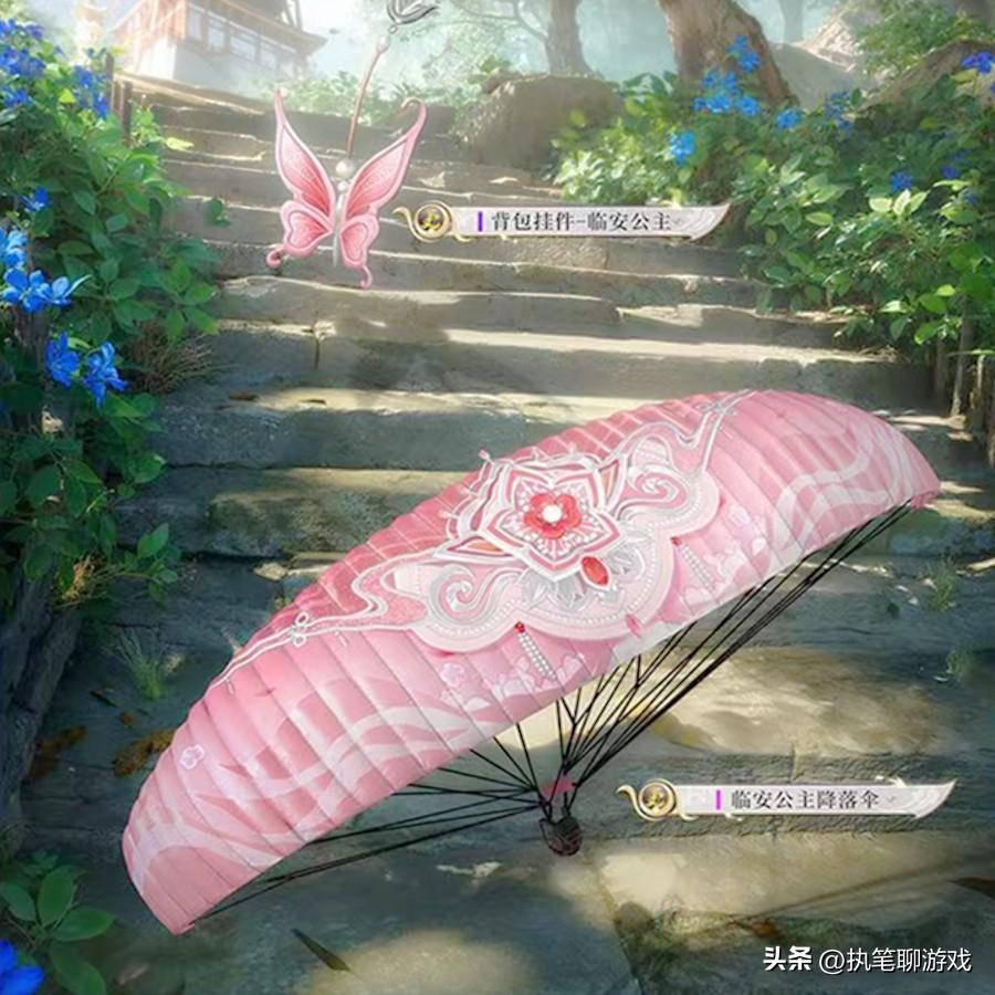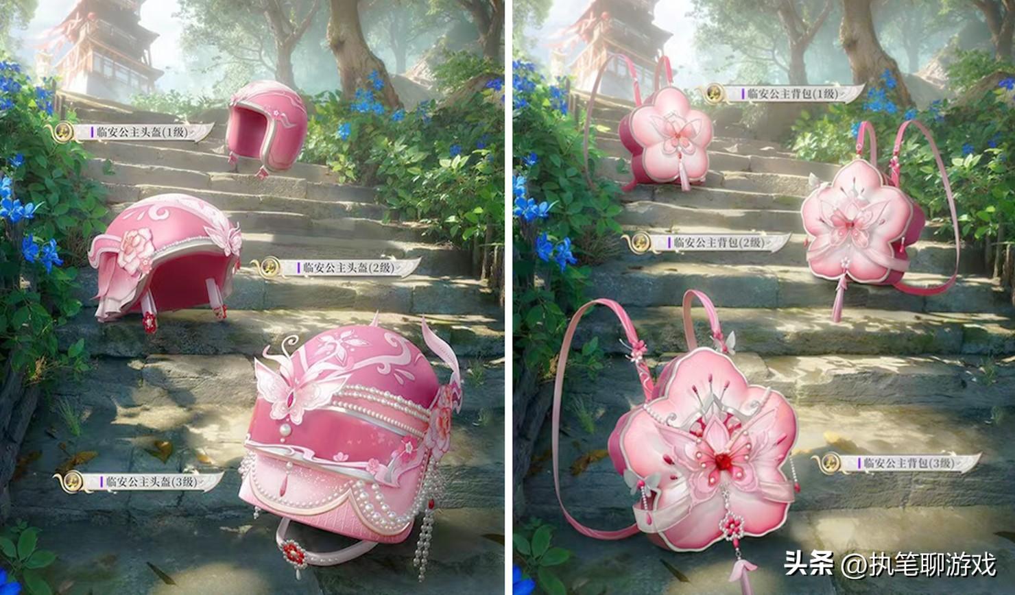 聊完了角色、槍皮的表現後,咱們來看剩下的頭盔、揹包、降落傘以及掛件,乍一看全是《和平精英》玩家比較青睞的“猛男粉”配色,但仔細一看名字,就讓人笑出了聲:全是臨安公主。