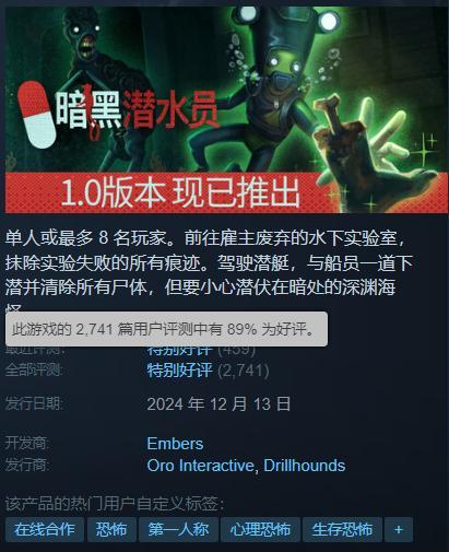 前段時間在線合作恐怖遊戲《暗黑潛水員》推出了自己的1.0正式版,口碑不錯,在Steam收穫了89%的好評率“特別好評”。
