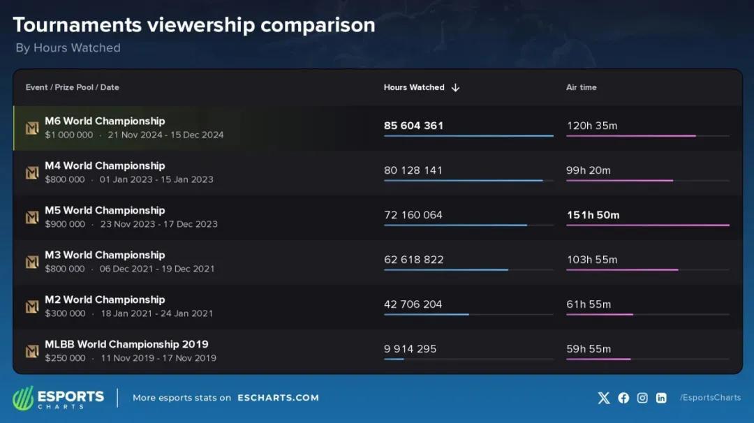 前不久剛結束的M6世界總決賽,還以8560萬總觀看時長,刷新了它的世界賽系列賽事記錄。