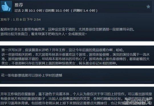 有玩家感慨,花一張電影票錢就可以彌補上學時的遺憾。更有網友大讚表示,開年王炸級的戀愛影遊,毫不遜色於完蛋本體,個人認爲是僅次於學習的上好佳作。