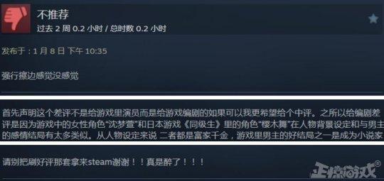 不過也有不少差評,其中有玩家就吐槽,強行擦邊感覺沒感覺。還有經驗豐富玩家直言遊戲抄襲表示,遊戲中的女性角色“沈夢萱”和日本遊戲《同級生》裏的角色“櫻木舞” 在人物背景設定以及和男主的感情結局有太多類似。